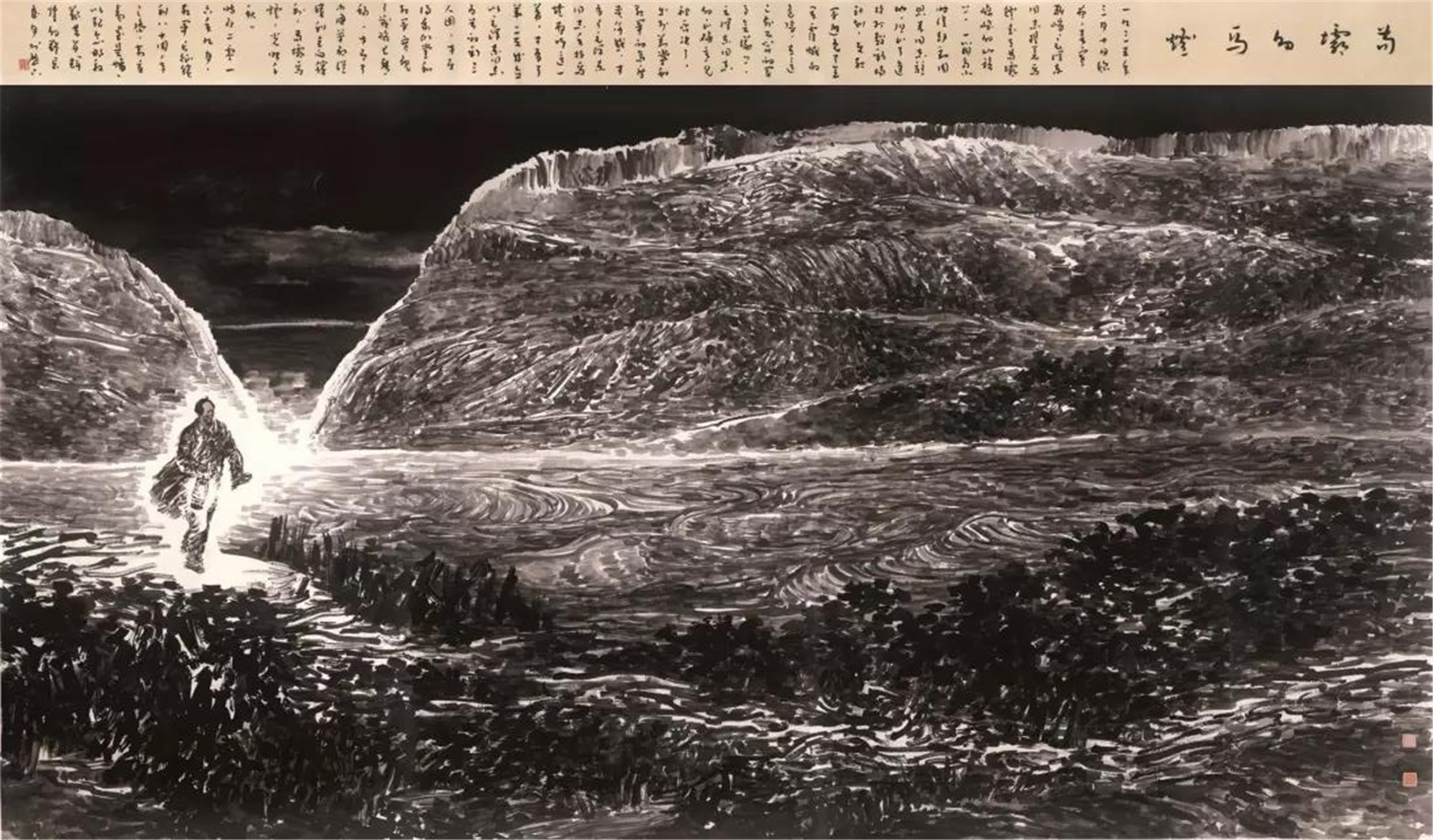 《苟坝的马灯》 题材取自1935年3月红军长征到达遵义苟坝一次军事会议。会议上毛泽东同志的正确意见被否决,他不顾个人名利与安危,夜提马灯走在崎岖山路上去找住在五里外的主管军事的周恩来,使局势化危为安。作品借鉴了山水技法,浓墨烘染出险恶气氛,毛泽东同志疾步前行,一盏马灯映照天地。